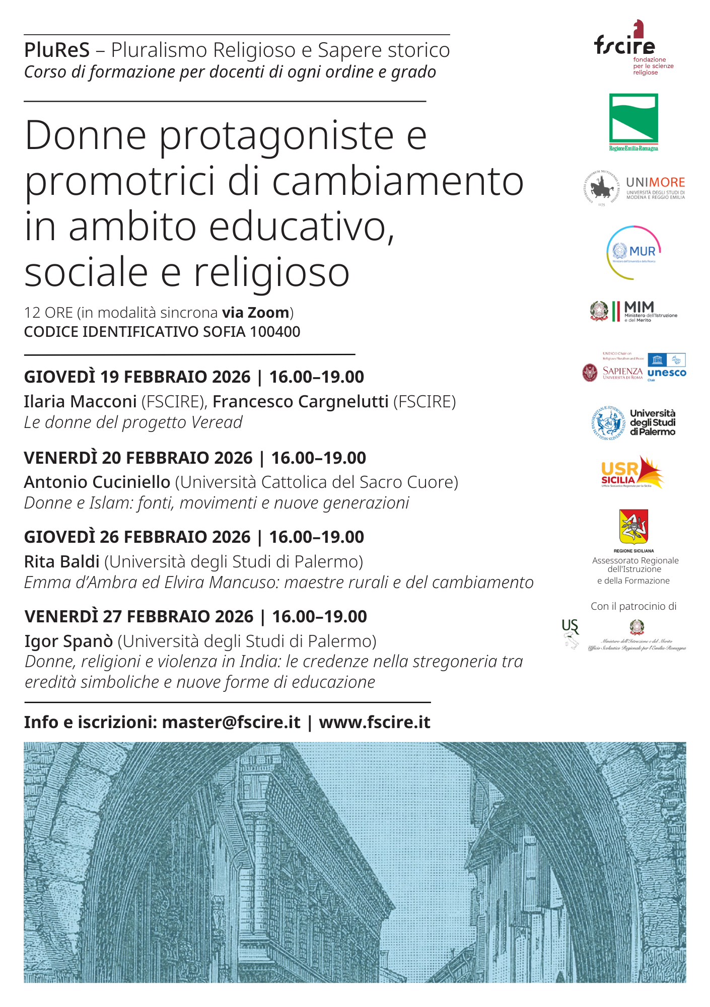 Sono aperte le iscrizioni per il nuovo ciclo di incontri dei corsi di formazione per insegnanti di ogni ordine e grado PluReS Donne protagoniste e promotrici di cambiamento in ambito educativo, sociale e religioso.