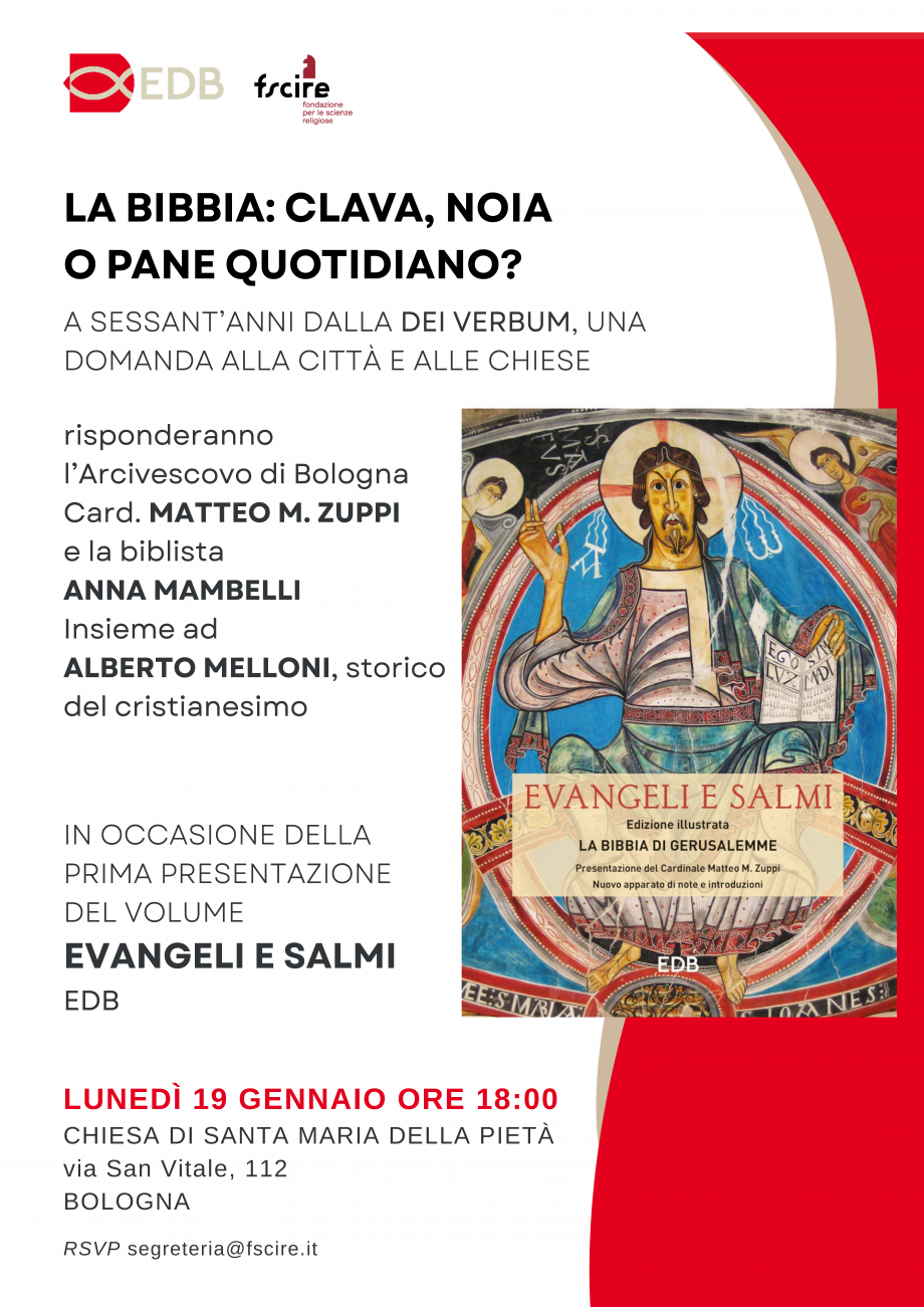 Lunedì 19 gennaio, alle ore 18.00, presso la Chiesa di Santa Maria della Pietà di Bologna, in via S. Vitale 112, si terrà l’incontro intitolato La Bibbia: clava, noia o pane quotidiano? A sessant’anni dalla Dei Verbum, una domanda alla città e alle chiese, in occasione dell’uscita della nuova edizione illustrata di Evangeli e salmi. La Bibbia di Gerusalemme (EDB, 2025).