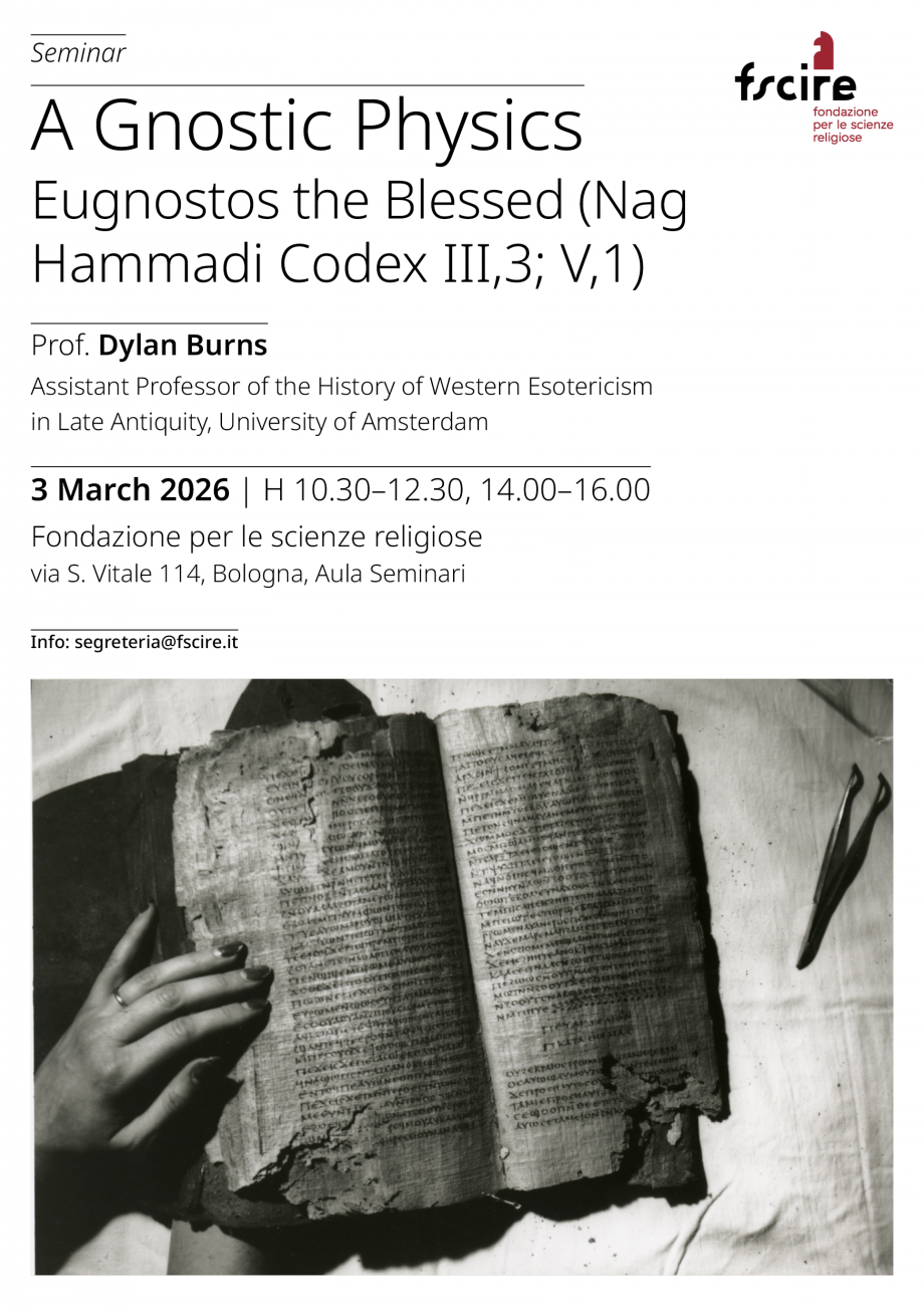 On Tuesday, 3 March 2026, from 10.30 to 12.30 and from 14.00 to 16.00 (CET), at the Fondazione per le scienze religiose (via S. Vitale 114, Bologna), the seminar A Gnostic Physics. Eugonostos the Blessed (Nag Hammadi Codex III,, 3; V,1) will take place.