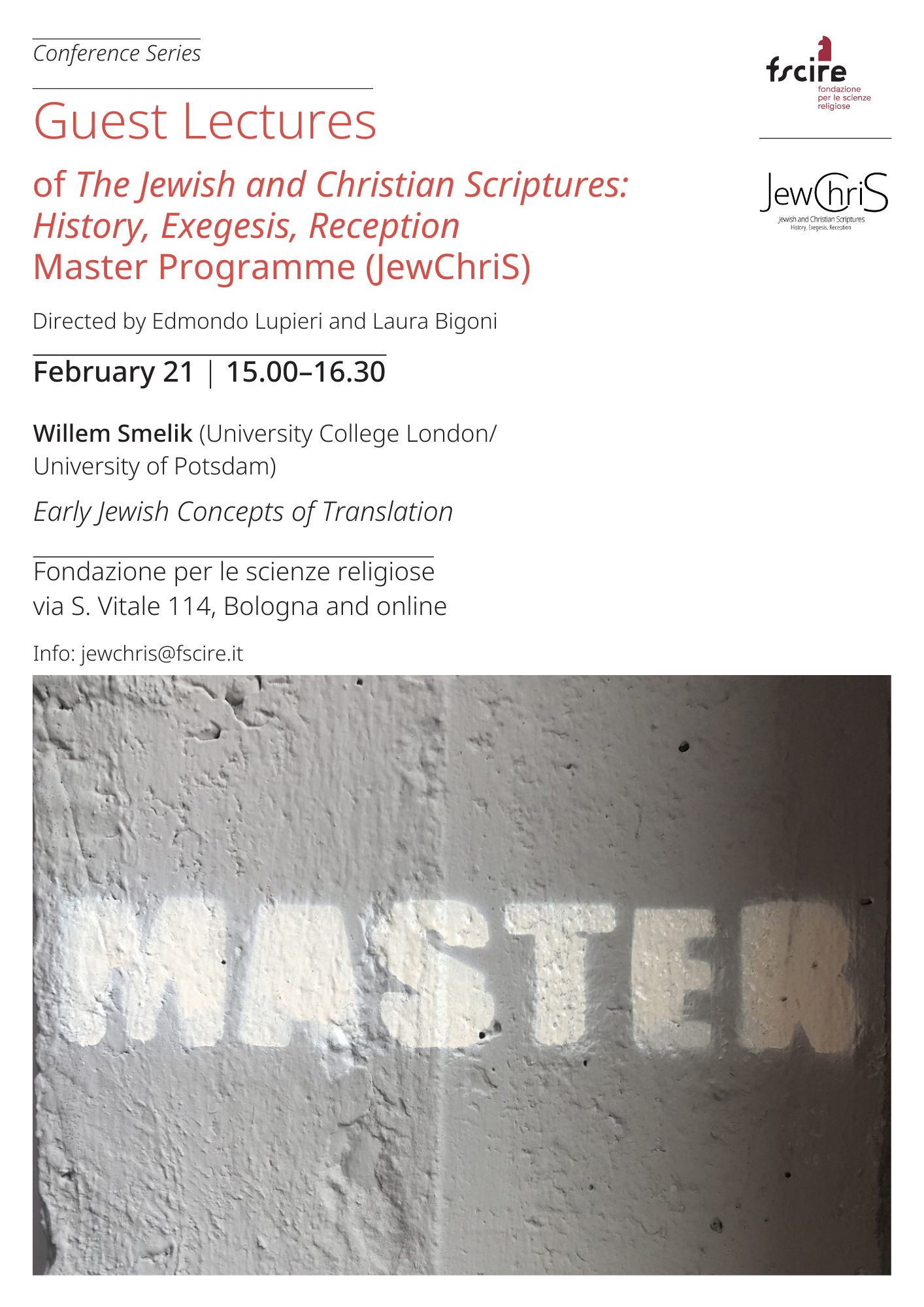 On Saturday 21 February 2026 the Fondazione per le scienze religiose will host the first Guest Lecture of the Master JewChris, the advanced programme that explores the historical formation of Jewish and Christian scriptures and the diversity of their exegetical traditions across centuries.